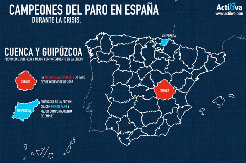 Además, la diferencia norte-sur cada vez es mas evidente. Mientras que provincias del norte de España se sitúan en el entorno del 15-20% con Guipúzcoa con una tasa incluso menor, 6 provincias andaluzas presentan una tasa de desempleo del 35 % destacando Cádiz como provincia española con mas desempleo superando el 40% del paro. Si tomamos datos del empleo juvenil la situación aún es todavía peor, con una tasa del desempleo del 55% en España y con muchas provincias con tasas superiores al 65%.